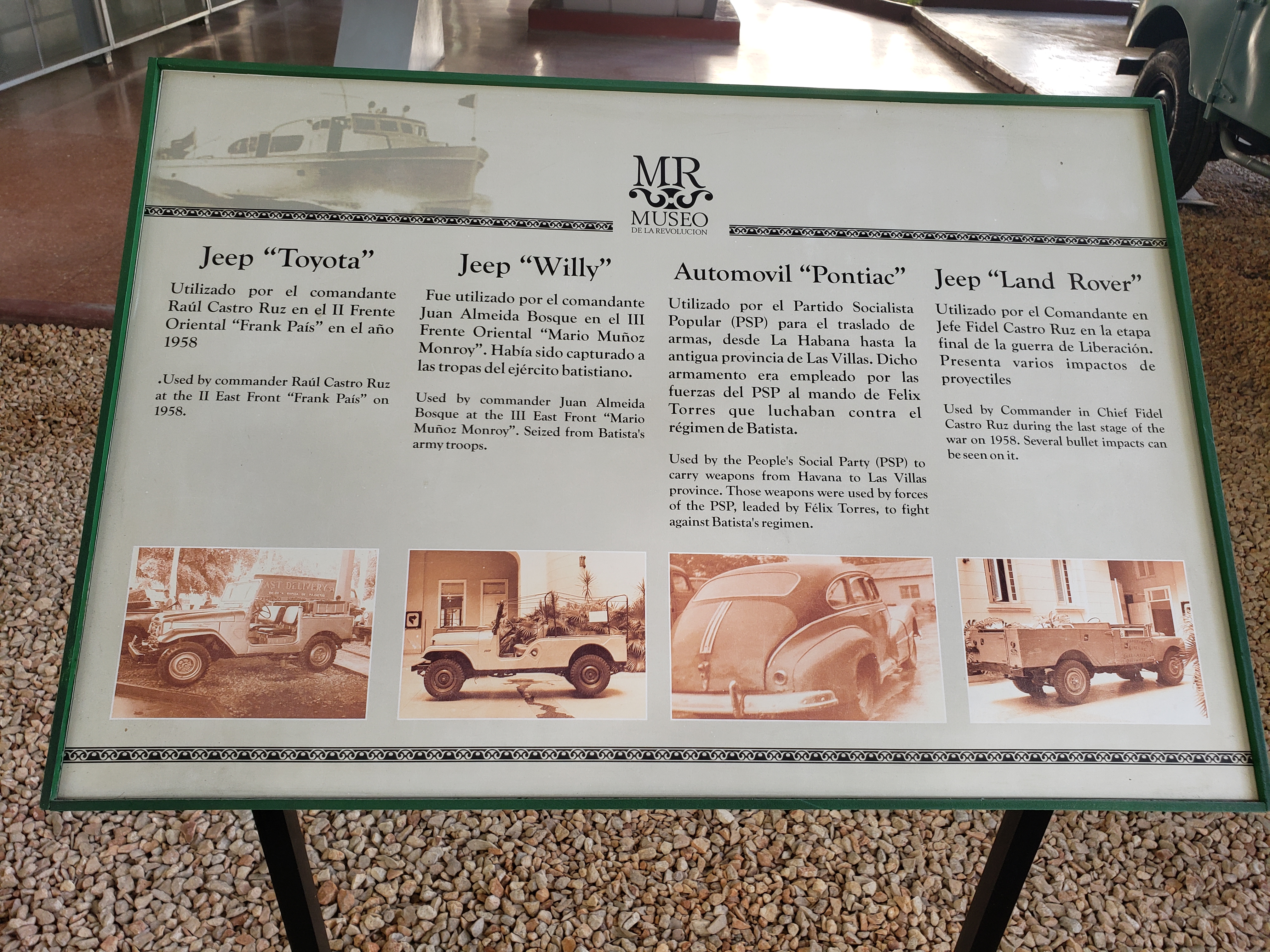 Behind the museum is Pabellón Granma, a memorial to the yacht that carried Fidel Castro and other revolutionaries from Tuxpán, Mexico, to Cuba in December 1956 to launch the Revolution. The yacht is surrounded by some of the vehicles and weapons used in their battles against Batista and during the failed Bay of Pigs invasion by the CIA.